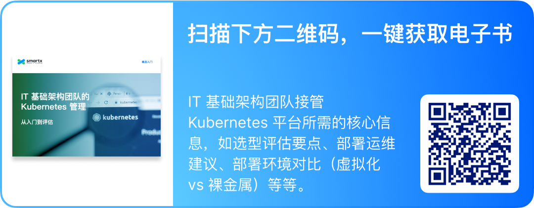 为了帮助更多用户快速上手 Kubernetes,我们整理了电子书《IT 基础架构团队的 Kubernetes 管理:从入门到评估》,详细解析 Kubernetes 部署运维技巧和管理工具选型建议,并于近期更新了新章节——基于虚拟化与裸金属环境部署 Kubernetes 的架构、特性、性能与适用场景对比。欢迎扫描下方二维码,一键获取最新版电子书!