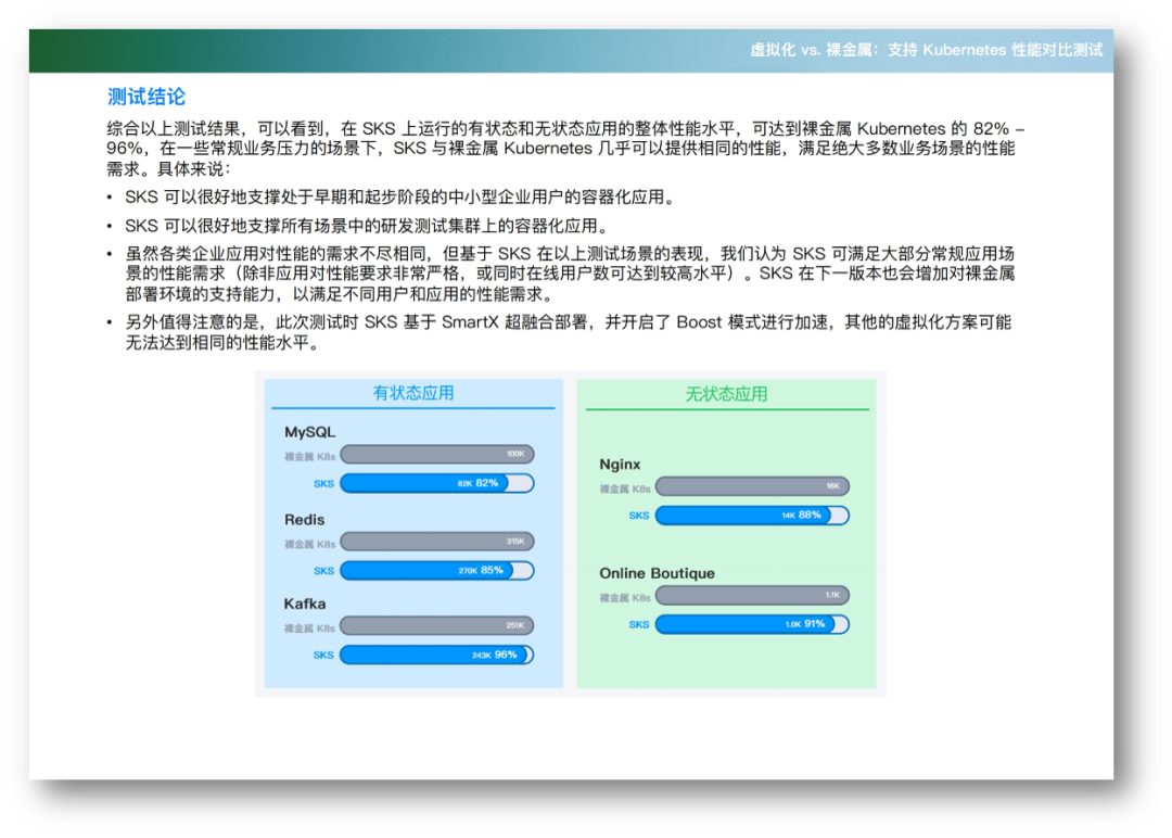 经过测试对比,SMTX Kubernetes 服务(基于虚拟化/超融合环境部署)运行有状态和无状态应用的整体性能水平,可达到裸金属 Kubernetes 的 82% - 96%;在一些常规业务压力的场景下,SKS 与裸金属 Kubernetes 几乎可以提供相同的性能,满足绝大多数业务场景的性能需求。
