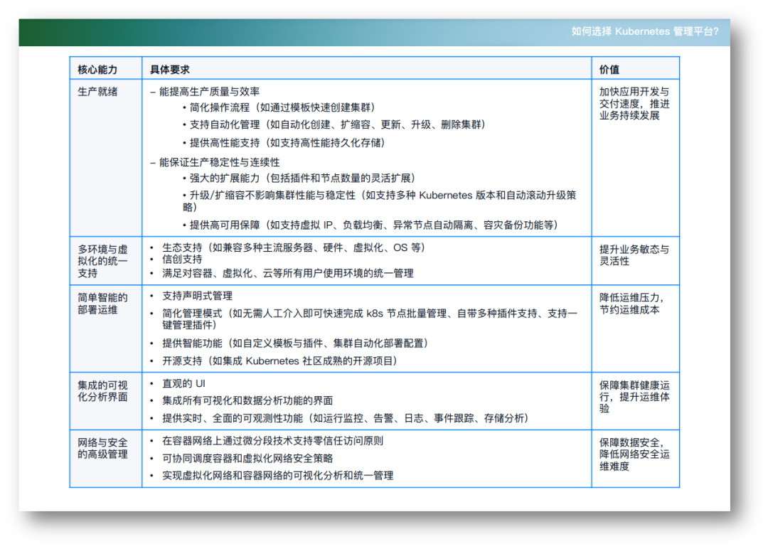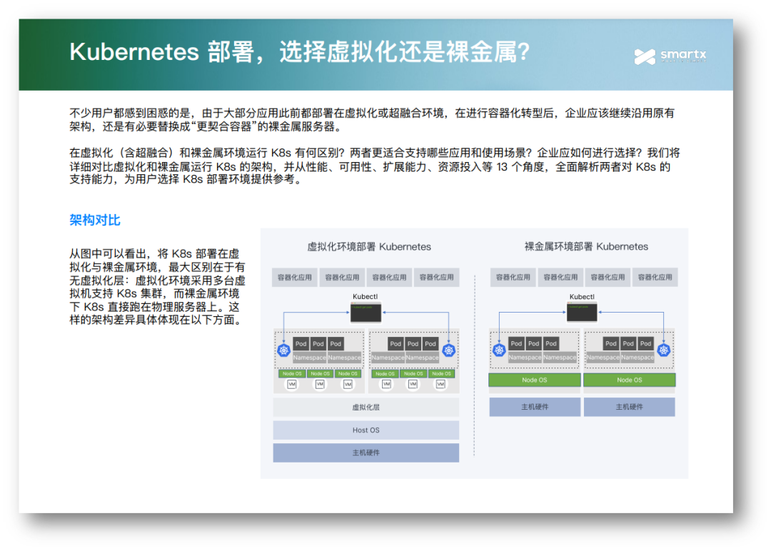 在架构方面,虚拟化环境与裸金属环境部署 Kubernetes,最大的区别在于虚拟化层的有无。正因如此,虚拟化环境对资源的整合和利用率更高,具有更强的横向扩展能力、集群生命周期管理能力、高可用功能和内核/存储/网络独立性,在提升运维效率的同时保护数据安全。而裸金属环境由于减少了虚拟化层开销,在性能与成本投入方面更具优势。