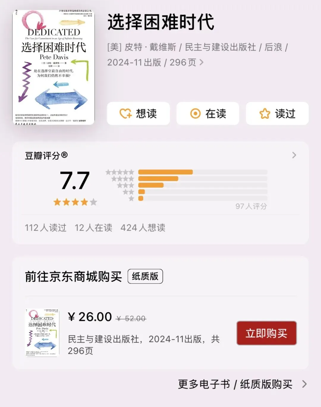 每晚追剧还是学习?选油车还是电车?心疼男二又放不下男主——现代人正陷入“无限浏览模式”的困境。哈佛毕业典礼演讲者、新锐作家皮特·戴维斯在《选择困难时代》中犀利指出:当多元价值沦为选择瘫痪,我们成了自己人生的旁观者。