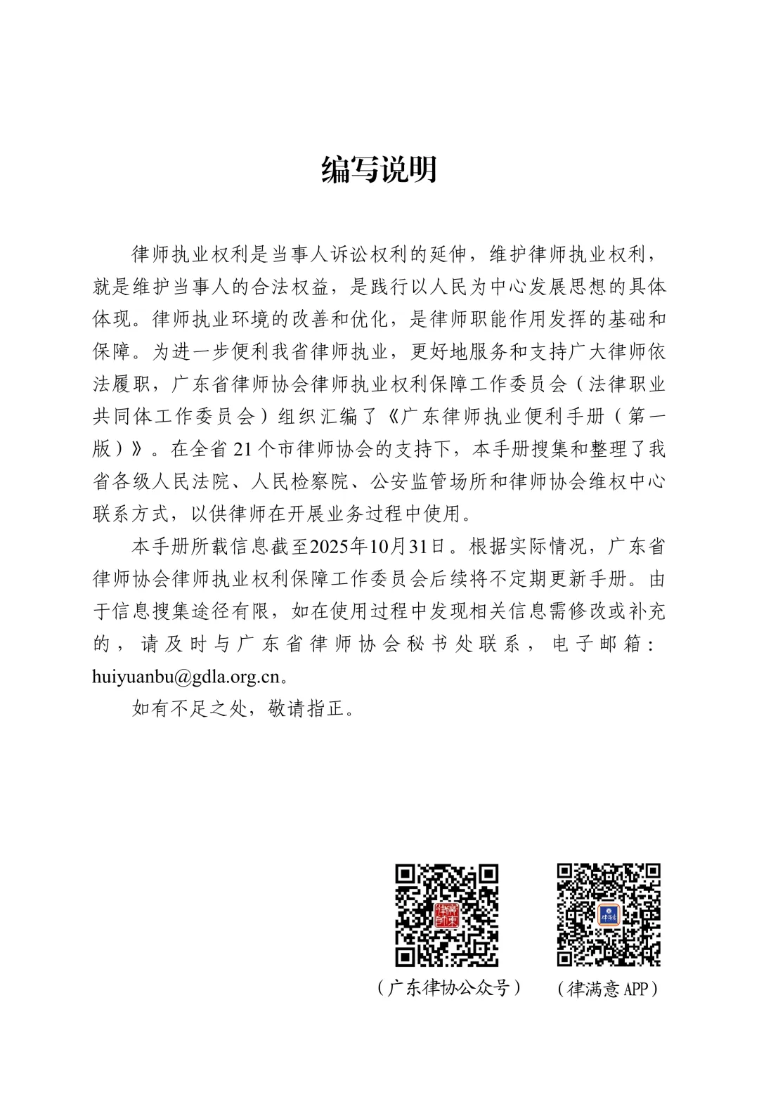 本手册所载信息截至2025年10月31日。根据实际情况,广东省律师协会律师执业权利保障工作委员会后续将不定期更新手册。由于信息搜集途径有限,如在使用过程中发现相关信息需修改或补充的,请及时与广东省律师协会秘书处联系,电子邮箱:huiyuanbu@gdla.org.cn。
