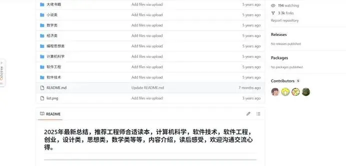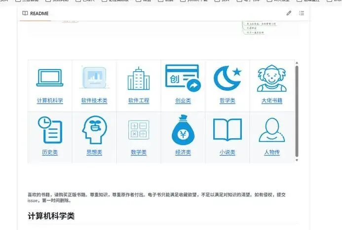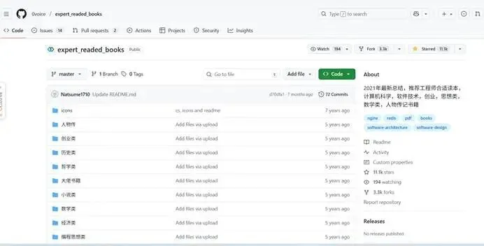 项目作者仍在保持更新和维护。书库中,书籍种类包含:哲学、数学、历史、创业、人物传记、经济、经典小说、计算机科学,软件技术,软件工程,设计思想。