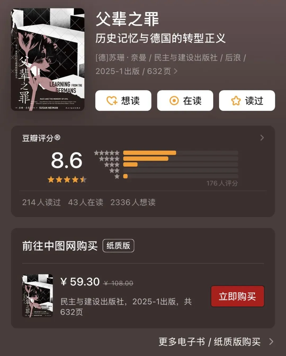这既是一部比较政治学的精密文献,也是一本写给所有负重前行民族的启示录。在篡改历史与过度忏悔之间,奈曼指出第三条道路:唯有诚实的记忆,能让我们在罪孽废墟上重建未来。翻开此书,你将面对的不仅是历史,更是我们此刻必须做出的选择。