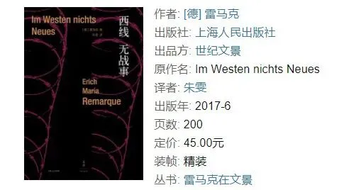 雷马克的《西线无战事》没有宏大的战争叙事,只有一群少年在炮火中碎裂的青春。