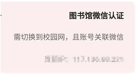 备注:采用“图书馆微信认证”读者需要在IP范围内认证(校园IP范围内有线网络或无线网情况下方可认证成功),4G/5G移动网络或者外部网络无法认证成功。