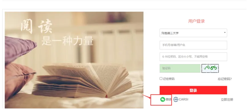 输入PC端网址,直接点击微信图标,用之前IP范围内认证登录过的微信扫描页面上的二维码即可登录阅读。