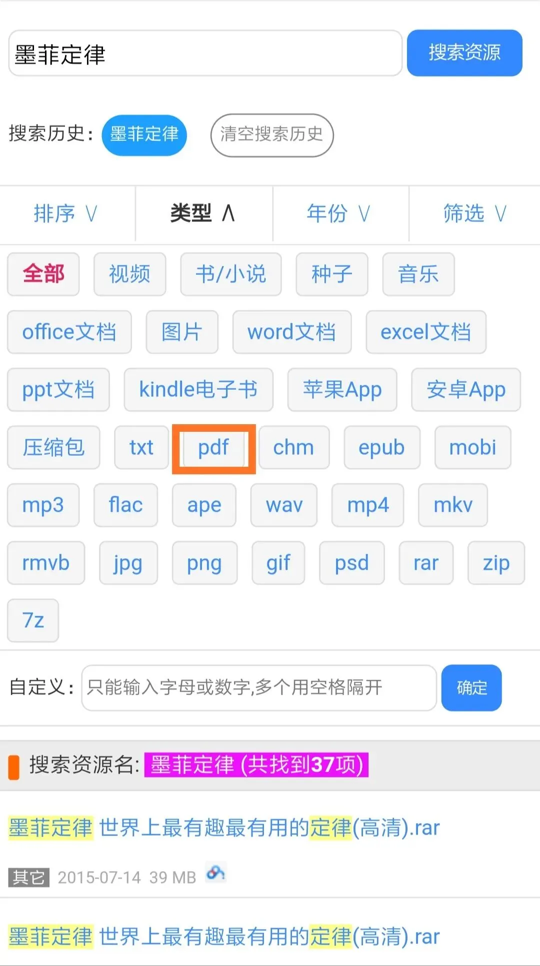 第二步,输入自己想要的书藉名称,比如墨菲定律,点击“搜索资源”,出现所有关于关键词的资源,点类型可以筛选自己想要的资源类型,比如PDF……