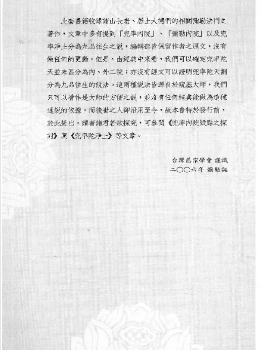 全书共十册:第一册为:太虚大师等著《弥勒净土法门续编》、念西大师著《弥勒菩萨本末大是因缘记》、幻生大师著《弥勒信仰及其应化事迹》,分别从义理、历史方面阐述弥勒净土;第二册为:明夷法师著《兜率鼓声》、慈弘居士著《慈宗法门概述》,一为理论著作、一为普及读物,是慈宗法门的重要书籍;第三册为:常照法师等汇《大慈弥勒菩萨法集》;第四册为:如吉法师等撰《弥勒法门真义再述》;第五册为:成一长老汇《弥勒净土法门集》、海天大德著《弥勒人间应化迹》、演慈法师撰《弥勒信仰》;第六册为:慈德居士著《慈宗导航》;第七册为:慈德居士著《弥勒菩萨的尊贵与净土法门的殊胜》;第八册为:慈宗行人著《弥勒净土法门概要》等,均为慈宗法门的重要书籍;第九册为:《弥勒图像集》,以彩色图像为主,有部份黑白图像,是弥勒净土法门的主要图像范本;第十册为:《慈宗宝鉴全集光碟》,是是弥勒净土法门的主要音乐范本。
