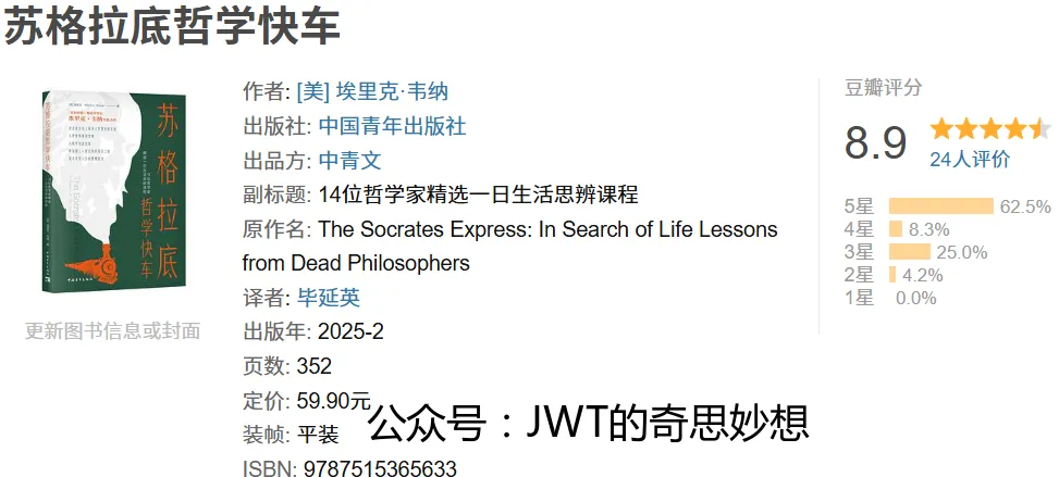 《苏格拉底哲学快车》是美国作家埃里克·韦纳的哲学普及著作,副标题“14位哲学家精选一日生活思辨课程”点明其核心构思。本书以“列车旅行”为隐喻,邀请读者登上哲学快车,在14个站台邂逅从古希腊到现代的不同哲学家,通过他们的一日生活片段学习如何将哲学思辨融入日常。