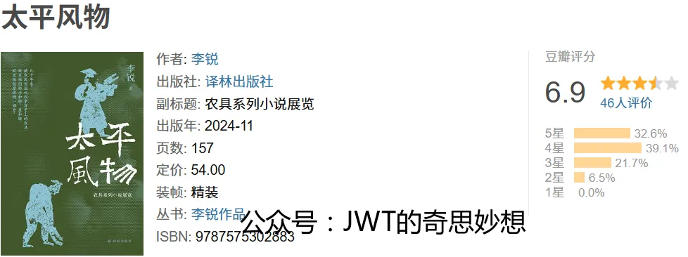 《太平风物》是李锐创作的短篇小说集,副标题“农具系列小说展览”揭示其独特构思。本书以传统农具为叙事线索,每篇围绕一件农具展开,在农耕文明的物象中寄托对土地、历史与人之生存的深沉思考。