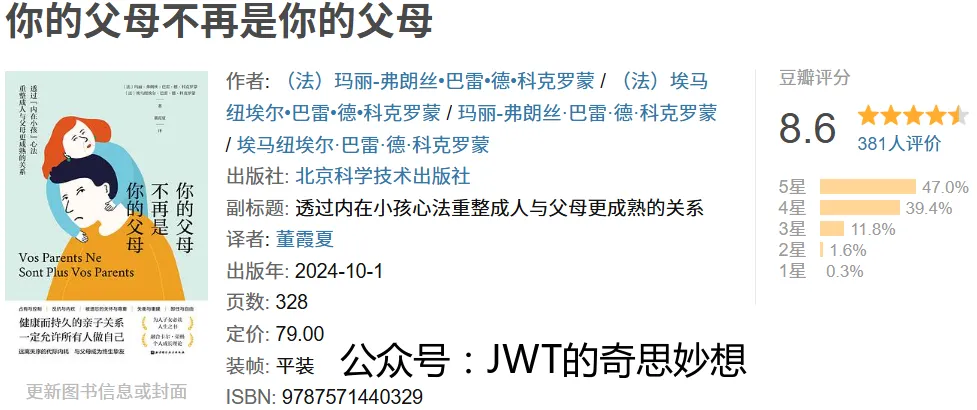 《你的父母不再是你的父母》是法国心理学家玛丽-弗朗丝·巴雷·德·科克罗蒙等人的著作,中文版由北京科学技术出版社出版。本书以“内在小孩”心理疗法为核心,旨在帮助成年人重新审视与父母的关系,实现心理层面的成熟与独立。