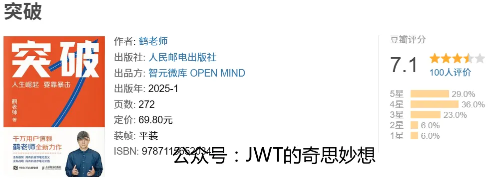 《突破》是鹤老师的最新作品,聚焦于个人成长与事业跃迁的核心命题。书中提出“人生崛起 要靠暴击”的鲜明观点,强调在变化加速的时代,主动迎接挑战、实现非线性突破的重要性。