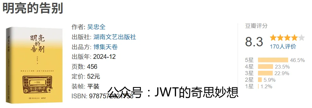 小说可能围绕主人公面对生命中的重要离别展开,在时间流转与往事回溯中,探寻告别的多重意味。吴忠全以细腻的笔触刻画人物内心的纠葛与成长,在悲伤与温情交织的叙事里,呈现“告别”如何成为理解爱与生命的一把钥匙。那些未能说出口的话、未能妥善处理的情感,或许在最后的“明亮”中找到了释然的可能。