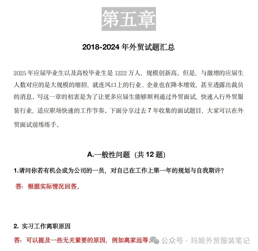 汇总了2018年-2024年收集的外贸行业面试题目,试题类型多样,包含“英语口语测试&小组讨论题、中英互译题、情景回信、计算题、图形推理题、单证/函电/船务题。