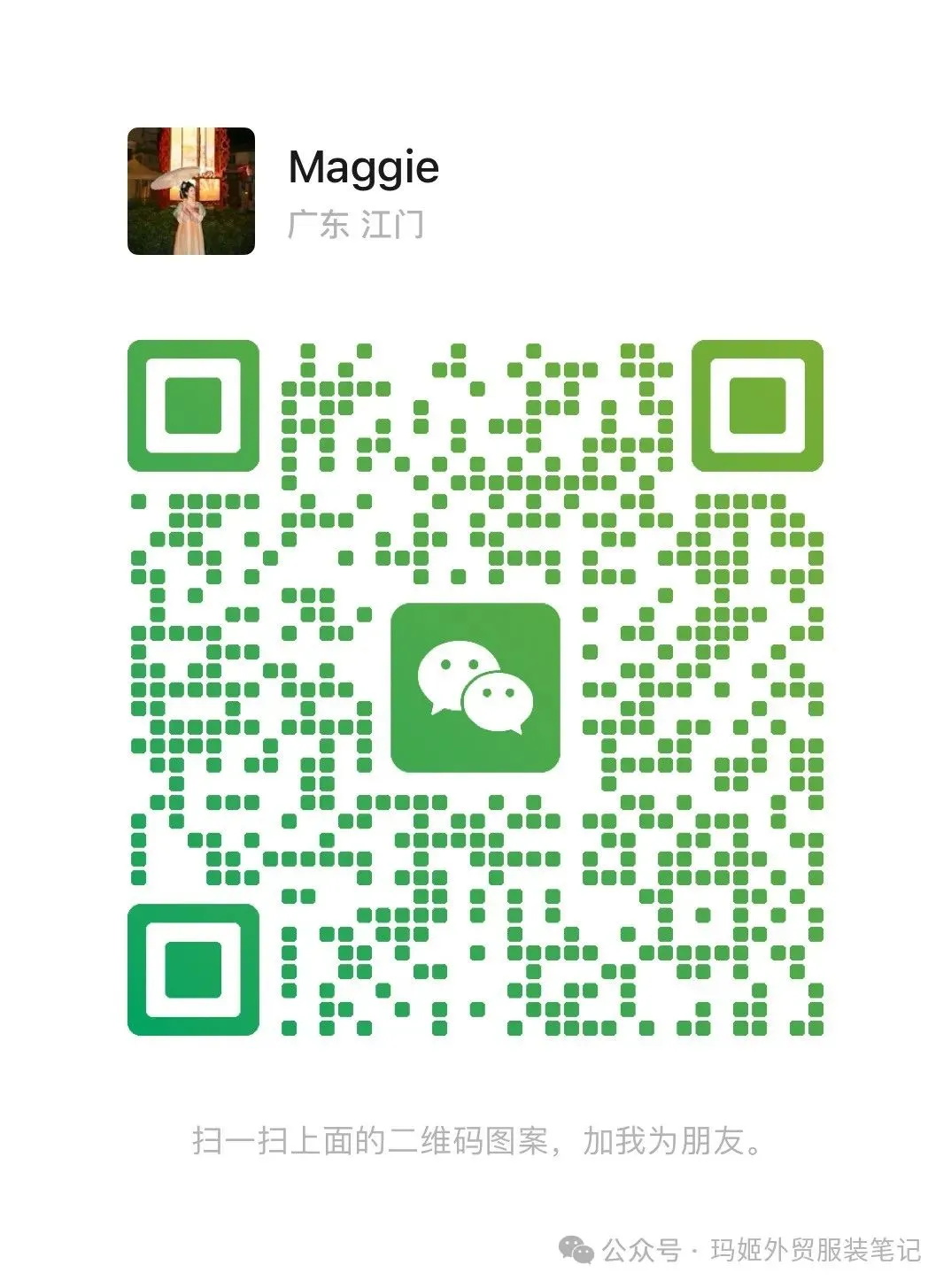想要买书的朋友,可以扫码添加Maggie微信咨询,备注:“购书”,电子书是通过微信发送给大家的。 另外,购书后即可成为会员,我会邀请您加入“玛姬外贸服装部落1群、2群或3群。(目前3个群仅剩4个位置)