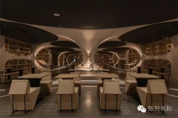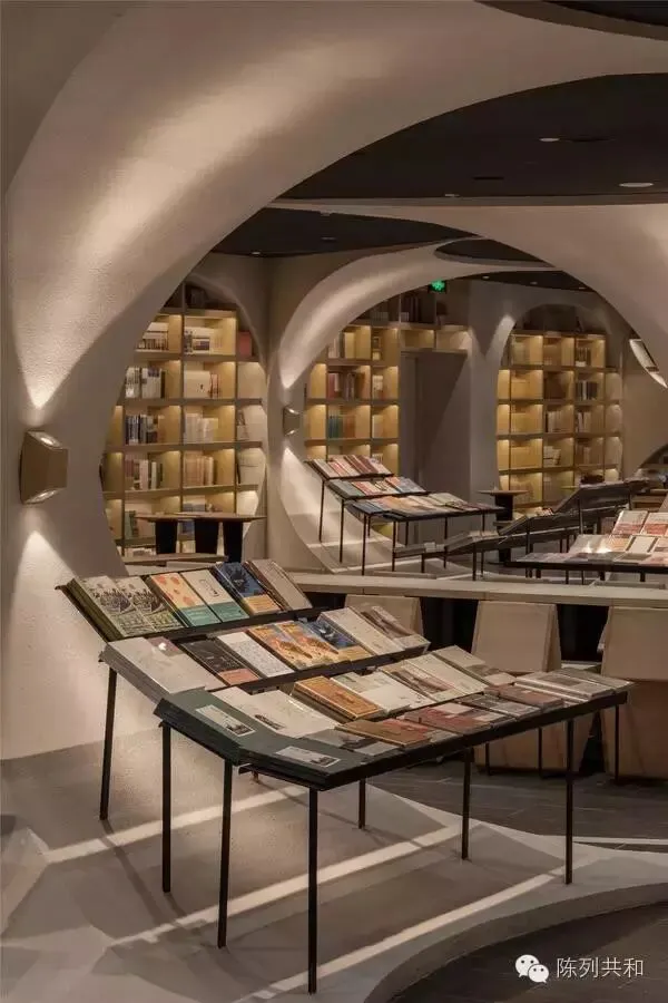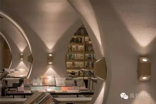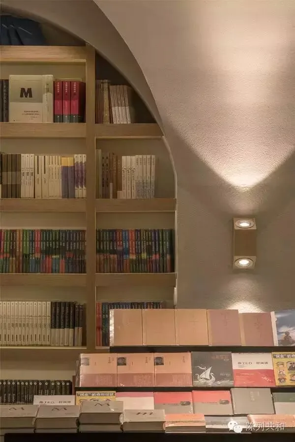 ▲配合弧度的结构,将书架也做成带有弧度的形状,这样带弧度的书架很好的配合整体效果,也让书本更加直观的展示给顾客看,非常好。