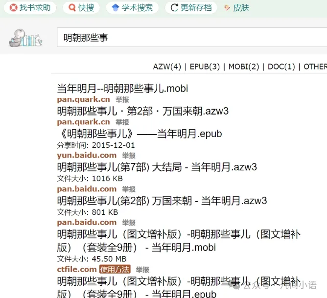 比如在搜索框输入“明朝那些事儿”(推荐,这本书真的很好看)就有很多格式的资源,一般我们选择下载epub格式的就好啦,多看阅读正好可以打开,也是适配epub比较好的阅读器。