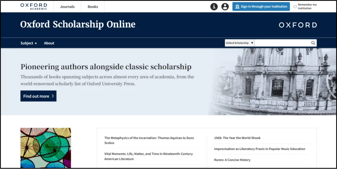 Oxford Scholarship Online(OSO)专门收录牛津大学出版社学术专著图书,它所收录的所有图书是由包括诺贝尔奖获得者在内的世界一流的学者所撰写,拥有值得信赖的高学术水准。目前Oxford Scholarship Online(OSO)拥有超30000余册的图书,学科涉及社会科学、人文科学、自然科学、医学等众多领域。