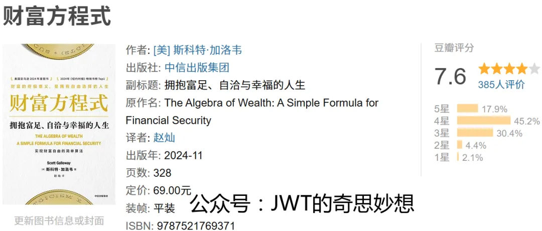 《财富方程式》是美国作家斯科特·加洛韦的著作,由中信出版集团出版,赵灿翻译。本书聚焦财富创造与个人生活的深层关联,提出一种系统且清晰的框架,旨在帮助读者在追求物质富足的同时,实现内在自洽与整体幸福。