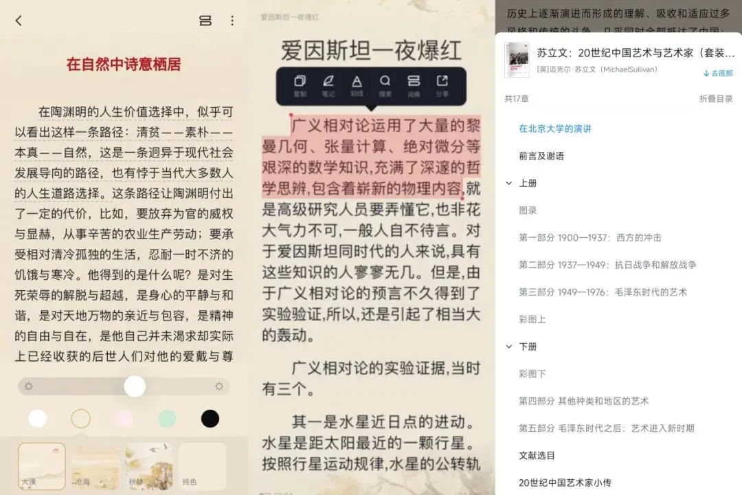 元阅读采用热门的epub流式排版,设计精致,允许用户根据个人偏好及阅读环境调整背景色彩与屏幕亮度。在阅读时,利用目录快速跳转,轻松定位,同时支持即时记录阅读心得。