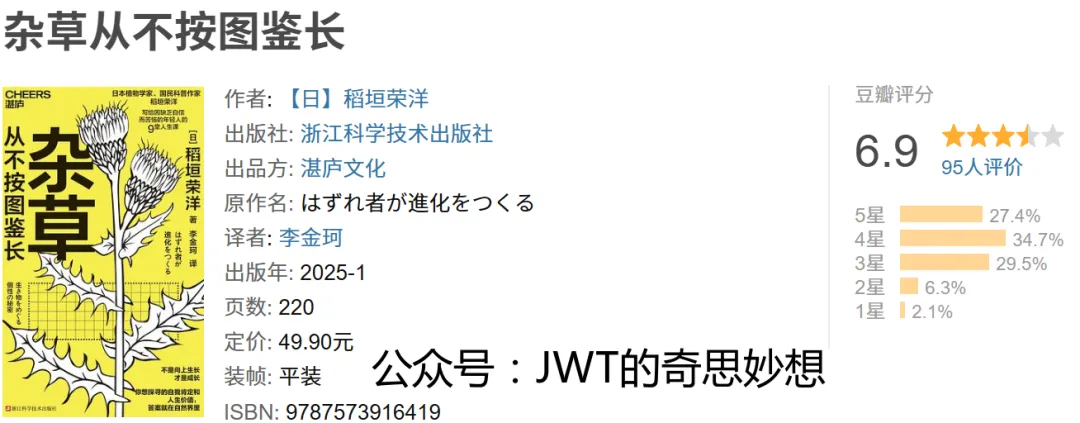 《杂草从不按图鉴长》是日本植物学家稻垣荣洋的科普作品,副标题“写给因缺少自信的‘杂草’们”揭示了本书的核心关怀。作者以“杂草”为隐喻,探讨那些偏离常规、不被主流认可的个体如何通过独特方式实现生存与进化,为那些缺乏自信的“异类”提供了一本充满希望的自然启示录。