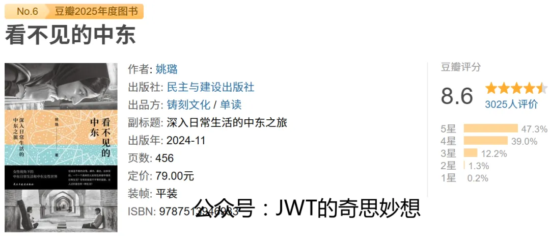 《看不见的中东》是姚璐的作品,由民主与建设出版社出版、铸刻文化与单读出品,副标题“深入日常生活的中东之旅”。本书聚焦于常被宏大叙事遮蔽的中东日常图景,以“看不见”为线索,引导读者超越地缘政治与宗教冲突的刻板印象,深入观察普通人的生活现场。