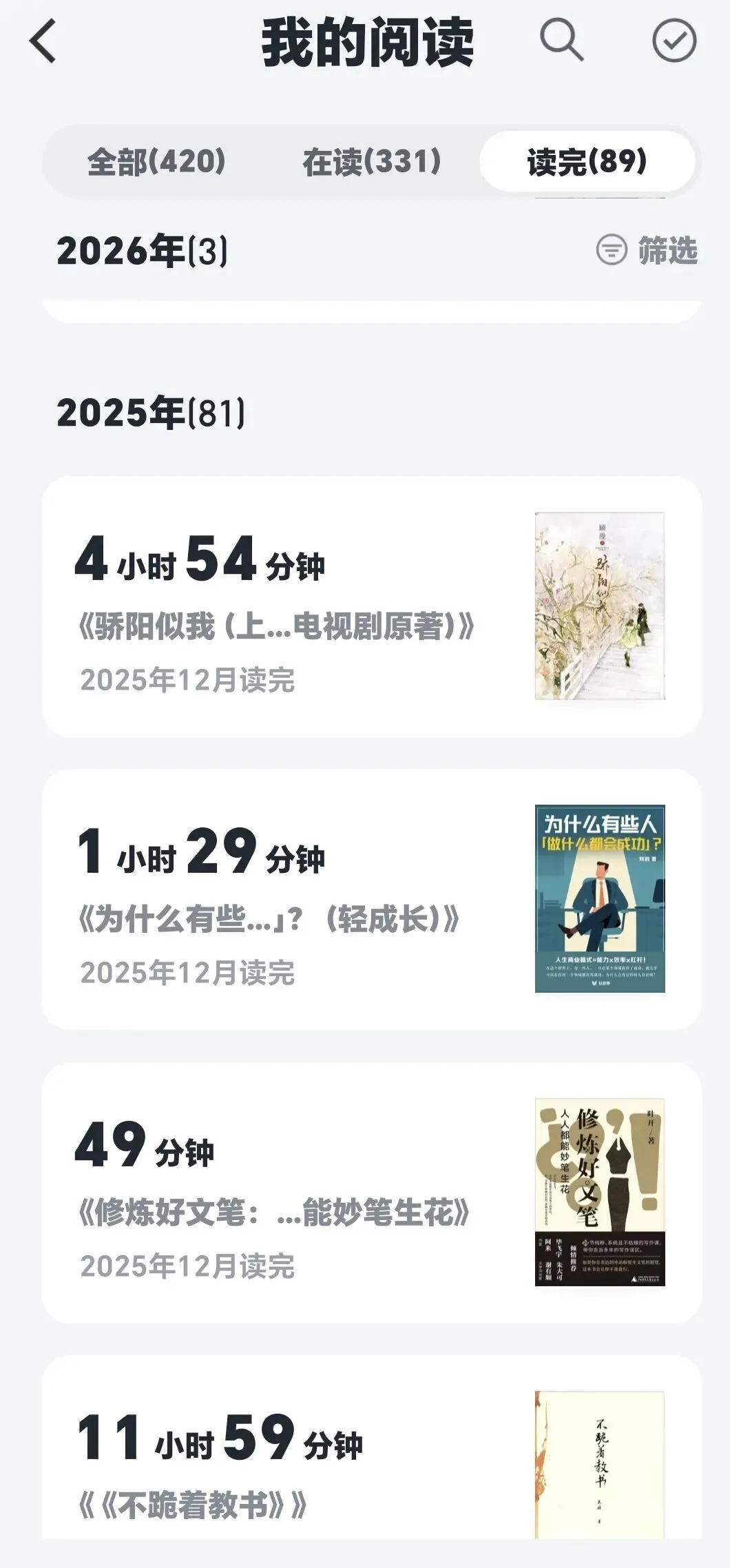 打开微信读书,盘点2025年我读过的书,发现本年度我完成读书81本,还有一部分书,只看了几页,或者是没有完成的书,今年读的比较多的书,包括这样几类,国学类:《道德经》《樊登讲论语》《论语》《王阳明知行合一》《曾国藩》等,这些书都对我的思想有很大的影响,尤其是曾国藩,我认为他是一个我们普通人学习的典范。第二类比较多的是教育类书籍:吴非《不跪着教书》《构建让学生喜欢的课堂》《听,学生们说》《费曼学习法》《海绵阅读法》等尤其是费曼学习法让我受益匪浅。第三类文学类《蒙曼解读诗径》《无人想要的我》《重生》他们都在熏陶着我,影响着我,当我读到颜朗的妈妈为了自己的梦想,一年372次被拒绝,仍然没有放弃时,我被她为自己的热爱而坚持的精神感动了。第四类哲学类《悉达多》《复利效应》《被讨厌的勇气》等看过了这么多书,却不知道自己记住了什么,也许并没有记住什么,有人说读书不是为了记住,而是在读的那一时刻,与你的心灵能够有共通,能够产生共鸣,能够对你的言行有所影响,这就足够了。一年来,除了电子书,纸质书也看了一些,可是没有记录,还有一部分也是在不知不觉中又重新拿起来重读一遍。包括很多的专业书,初中数学教学参考、《吴正宪老师教数学》,《卜以楼数学教学40年文集》等,查理芒格在99岁时说,“有人问我,这一生中最大的骄傲是什么?我说不是我挣了多少钱,那我要第一个要说的就是每天读书,我见过的成功的人,没有一个是不读书的,一个都没有!”