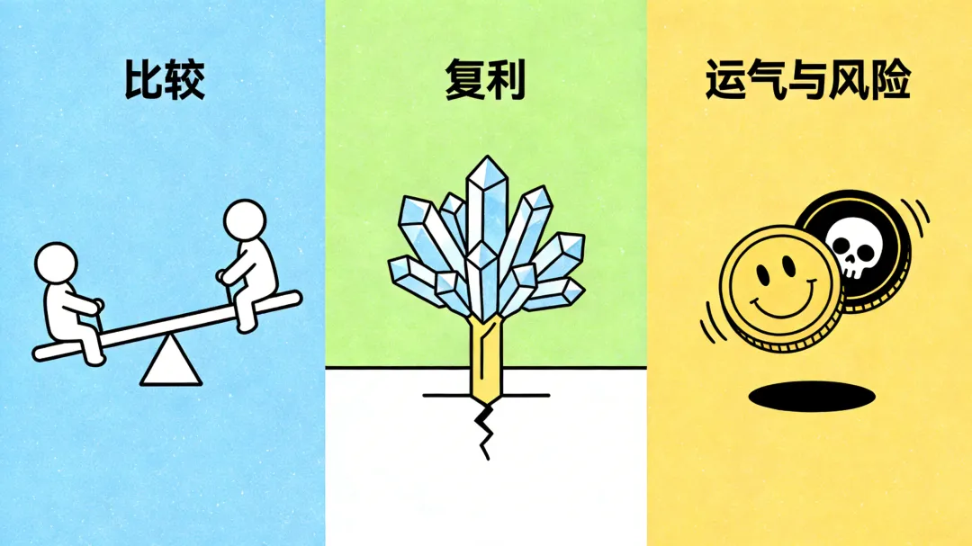 复利错觉: 人们痴迷于复利计算的完美曲线,却忽略了现实世界的波动。真正的复利智慧是:确保自己能持续留在游戏中,不被清零出局。能活下来,比短期的高回报重要得多。
