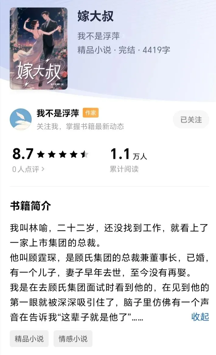 这个短篇是比较短的,总共只有4000多字,这个阅读量是没有多少收入的,有一个数据可以作为参考。