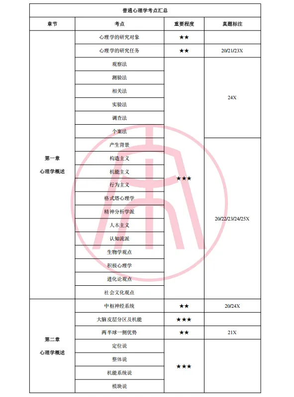 覆盖普心、人格、社心、研究方法、统计测量这些核心学科,每个考点标了重要程度(★到★★★),还附了历年真题题号和题型。比如 “睡眠周期” 标了★★★和 20/22/23/24/25X,备考北师大 MAP 的同学能精准抓重点