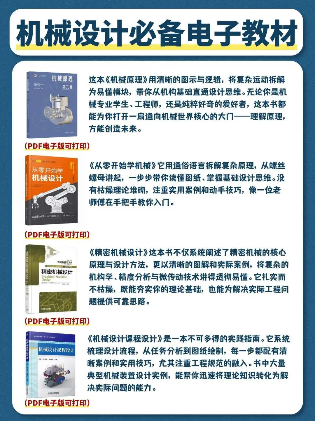 💕 想学和在学机械的朋友们看这里!四本学机械超好用的电子书可打印,还有一些机械设计的学习素材,朋友们码住!