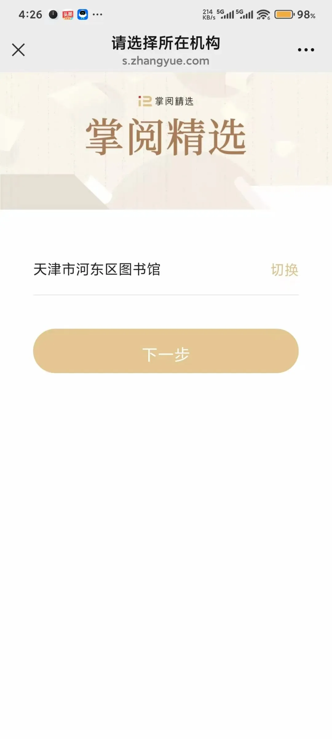 第二步:输入“天津市河东区图书馆”,选择“天津市河东区图书馆”后点击“下一步”