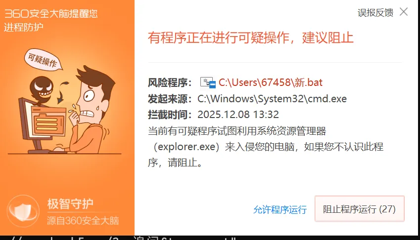 这是系统安全程序与杀毒软件误认为系恶意脚本,故进行报错、拦截。只要临时关闭系统安全提醒,临时禁用杀毒软件(如360、卡巴斯基),继续运行即可。