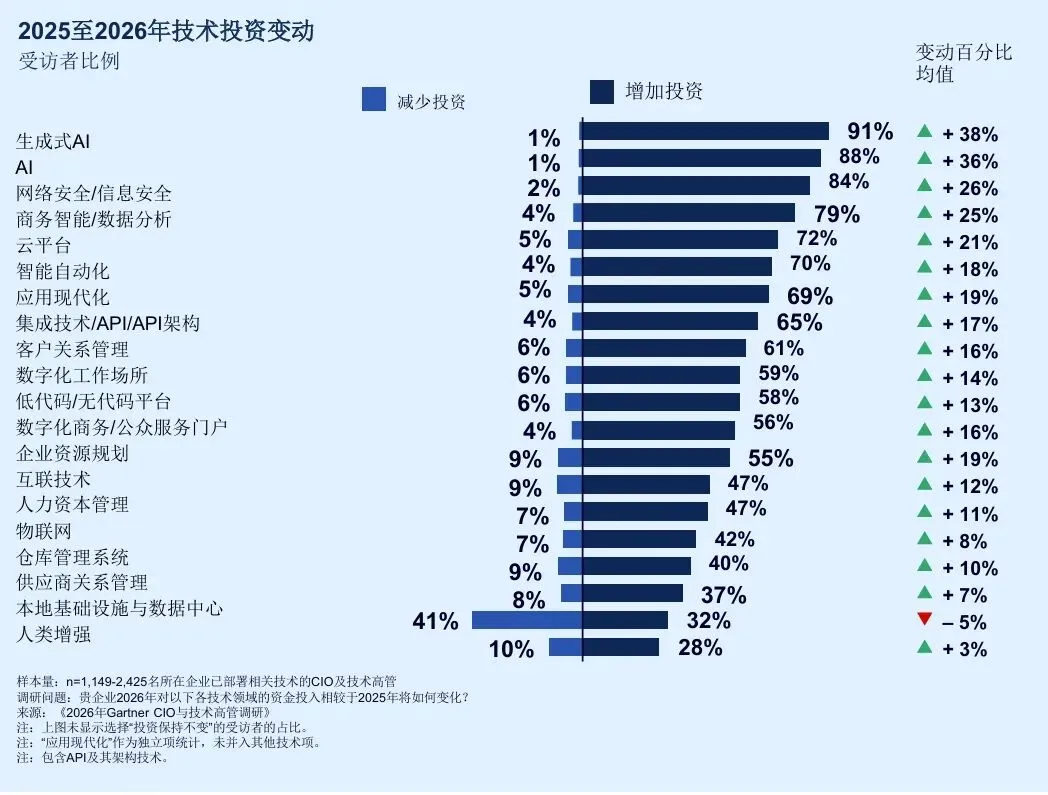 市场在变,企业必须随之调整策略。2026年,经济波动和预算压力正在重塑企业衡量成功的标准。IT预算仅略有增加,技术人员规模也难以扩张,这让“提升内部生产力”成为企业的当务之急。然而,在预算紧缩的背景下,技术高管却在逆势加大AI投入,尤其是代理型AI。这不仅是因为技术创新,更因为它具备更高的投资回报潜力。