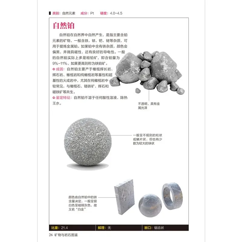 《矿物与岩石图鉴》一书中主要选取了具有代表性的231种矿物和65种岩石,对其进行了详细介绍,包括类别、成分、硬度、特征、成因、鉴定、比重、解理、断口、晶系等,并且还为每种矿物与岩石配了多角度的高清彩色图片,展示矿物与岩石的各部位特征,以方便读者辨认。