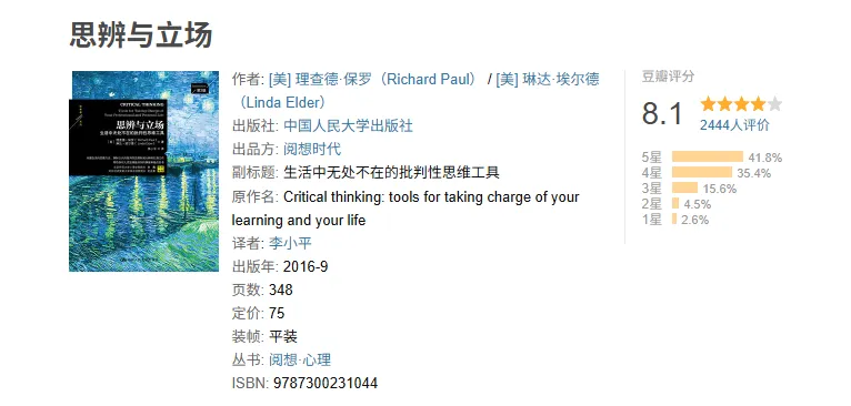 《思辨与立场》是美国批判性思维领域的权威理查德·保罗和琳达·埃尔德写的,原书名是《Critical Thinking》,是批判性思维的经典教材。