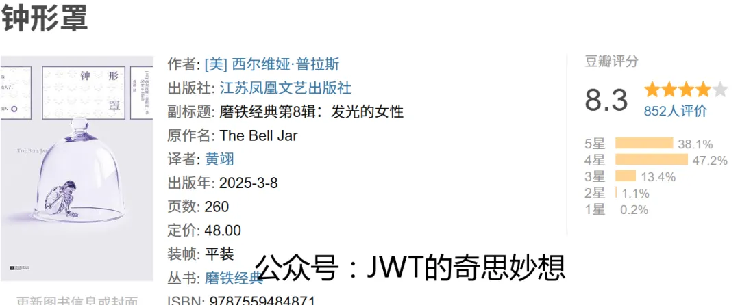 普拉斯以锐利而诗意的笔触,描绘了埃斯特在光鲜外表下的窒息感——她看似拥有令人羡慕的机会,却深感自己如同被困在透明的钟形罩内,与真实的生活和情感隔绝。书中对抑郁症的描写极其真实,交织着对性别角色、社会规范和精神健康的深刻反思。这部作品不仅是普拉斯个人挣扎的艺术呈现,也成为女性主义文学和心理健康叙事的重要里程碑。
