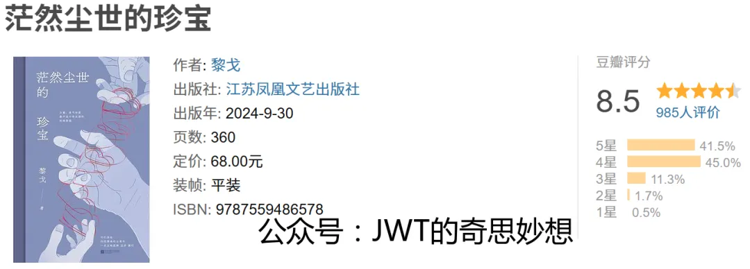 《茫然尘世的珍宝》是作家黎戈的散文集,以细腻沉静的笔触捕捉日常生活中的诗意与哲思。书中聚焦那些在喧嚣尘世中易被忽视的微小事物与瞬间——一片叶的纹理、一瞬光的偏移、一句偶然的话语,在作者眼中皆成为 抵御时间流逝的精神珍宝。