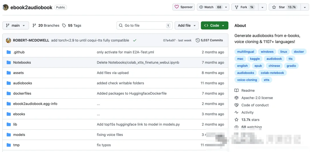 最近发现一个GitHub上的开源项目,ebook2audiobook,简直是我的福音!它在GitHub上已经斩获了 1.37 万 Star,社区反响热烈,许多开发者和读者都在积极使用和贡献。这个项目是由一群对阅读和音频技术充满热情的开发者们创建的,他们的愿景是让阅读变得更加便捷和个性化。项目名称 ebook2audiobook 顾名思义,就是把电子书(e-book)转换成有声书(audiobook),直白又高效。