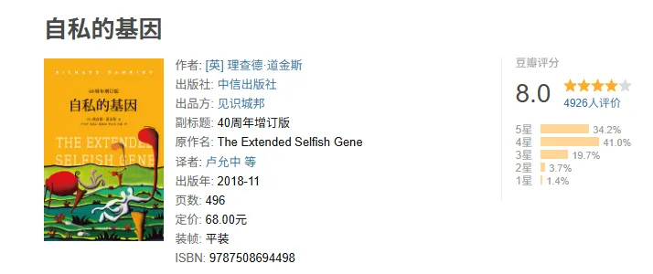 《自私的基因》是英国生物学家理查德·道金斯1976年出版的科普经典,提出了一个颠覆性的观点:基因才是进化的主角,生物只是基因的生存机器。