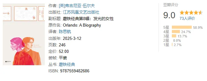 《奥兰多》是弗吉尼亚·伍尔夫为虚构人物创作的传记,首次出版于 1928 年。那一年,英国女性终于赢得了与男性公民同等的选举权,这本书在公众中引发的热烈反响也让伍尔夫成功拥有了“一间自己的房间”。伍尔夫将这部小说献给了她的好友、缪斯——薇塔·萨克维尔-韦斯特,她提供的灵感令她塑造出了历史上最著名的雌雄同体文学人物——奥兰多。一位16世纪的男性贵族,奇迹般地变成女性,穿越400年,抵达工业时代。性别、身份、艺术、爱情和历史,对于奥兰多而言,一切都在流动……您的每一个【点赞】【在看】和【转发】,都是我们坚持下去的最大动力!