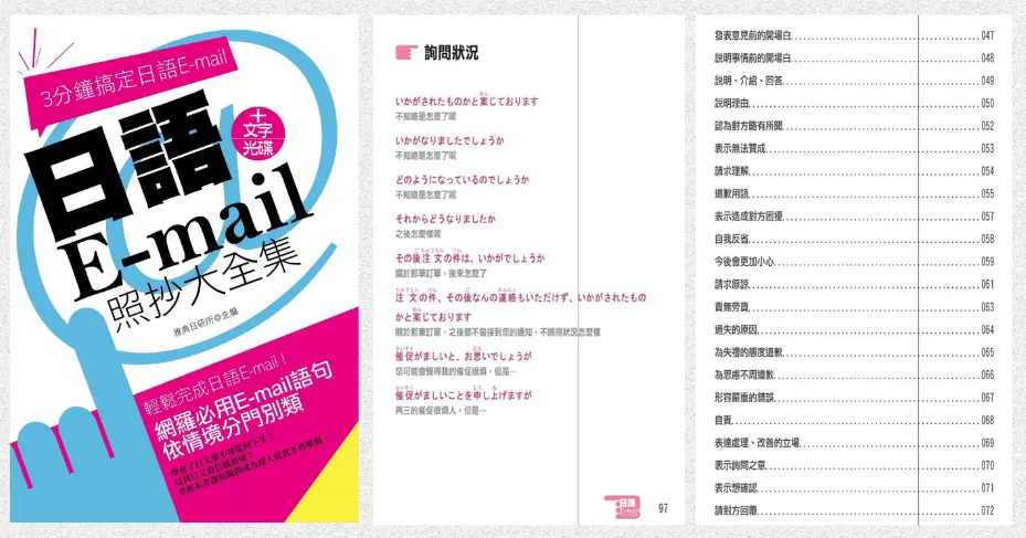 日文邮件写作神器《日语E-mail 照抄大全集 》,特点是依情境分门别类,便于组合套用。非常适合时不时会需要临时抱抱佛脚的朋友。