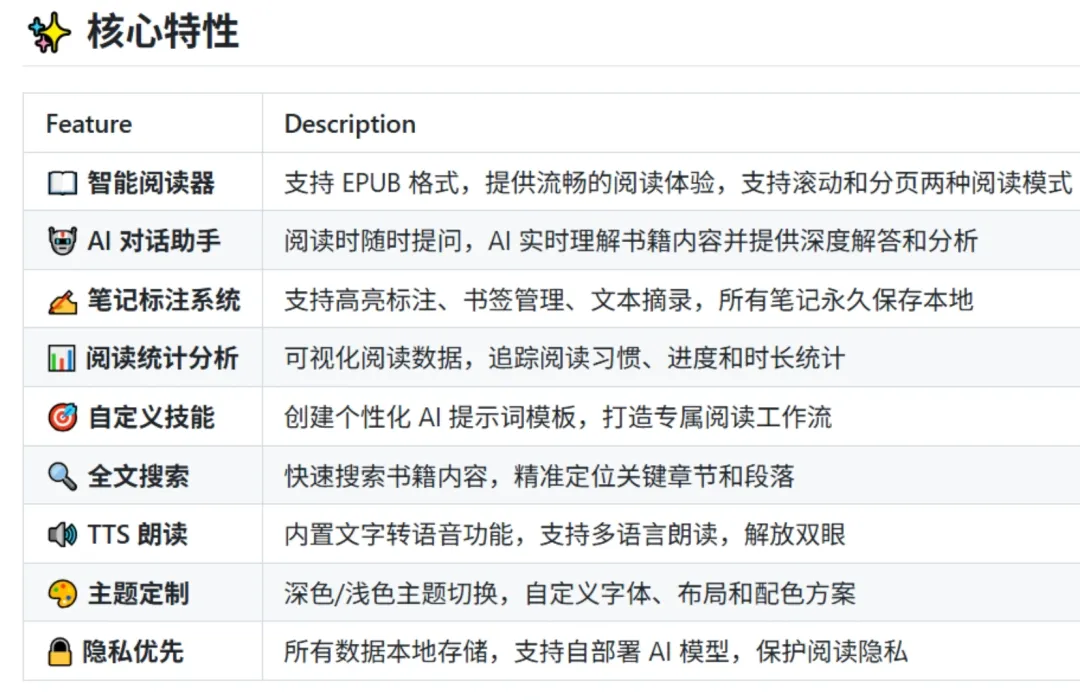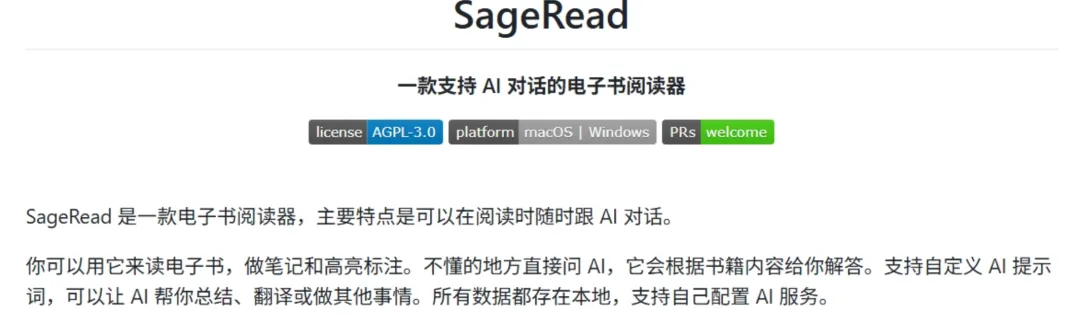 SageRead 是一款主打本地存储、AI 交互、跨平台支持的开源电子书阅读器,其他类似的还有以下软件: