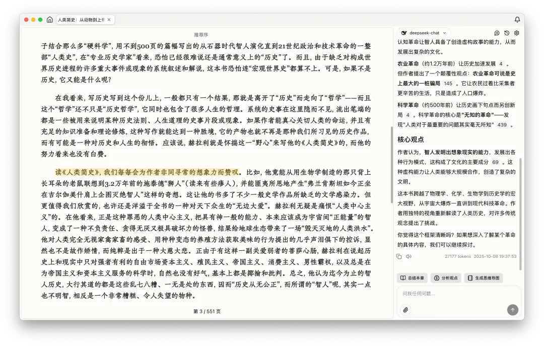随便打开一本书,就可以看到右侧有AI的窗口,这就是它的牛掰之处了。