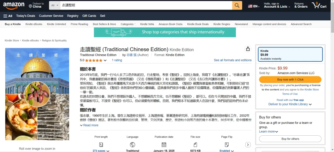 目前,《走读圣经》繁体版电子书已在亚马逊主站(Amazon.com)上架,大家若有购买需求,可以登录Amazon.com,以下是繁体版《走读圣经》电子书购买路径(复制链接,然后前往Amazon.com粘贴即可打开):