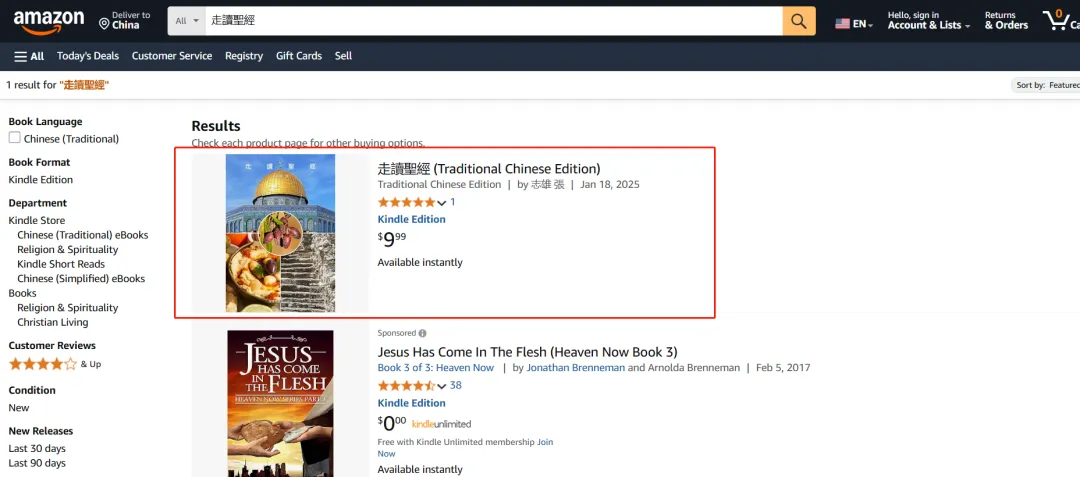 或者,也可以在Amazon.com上搜索“走讀聖經”(请使用繁体字)。但是,可能会遇到如下情形:没有搜到这本书。解决办法:将默认的收货地址改为美国的地址,然后重新搜索。(目前,本电子书上架于Amazon.com网站。亚马逊其他几个市场需再等几天才会上架。)