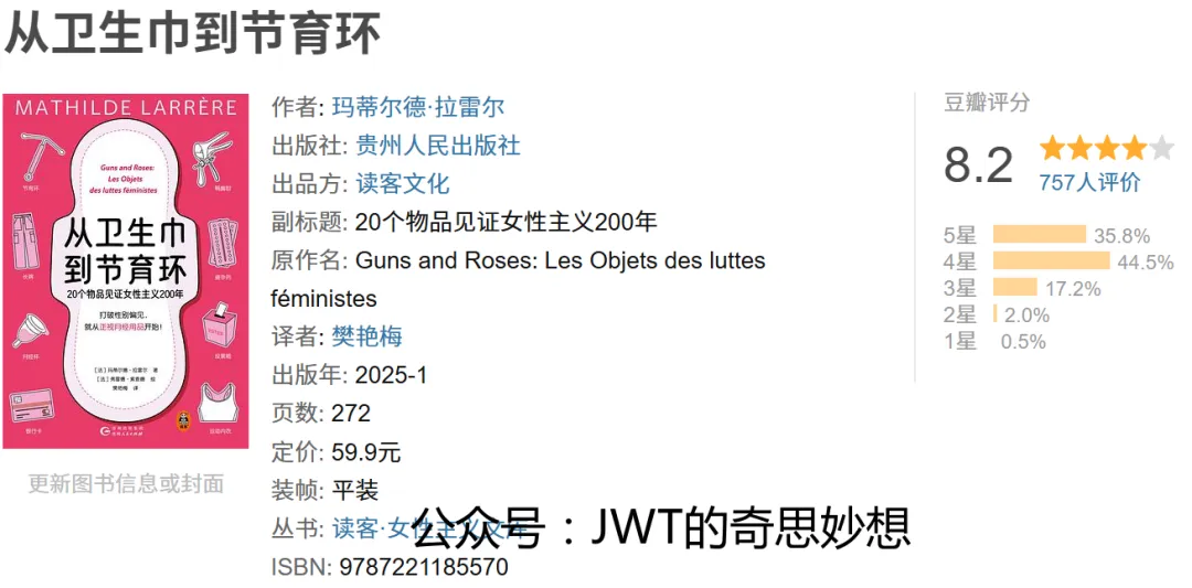 《从卫生巾到节育环》是法国历史学家玛蒂尔德·拉雷尔的著作,中文版由樊艳梅翻译,贵州人民出版社出版,属“读客·女性主义文库”。本书以20件日常物品为线索,串联起近两个世纪女性主义运动的发展历程。