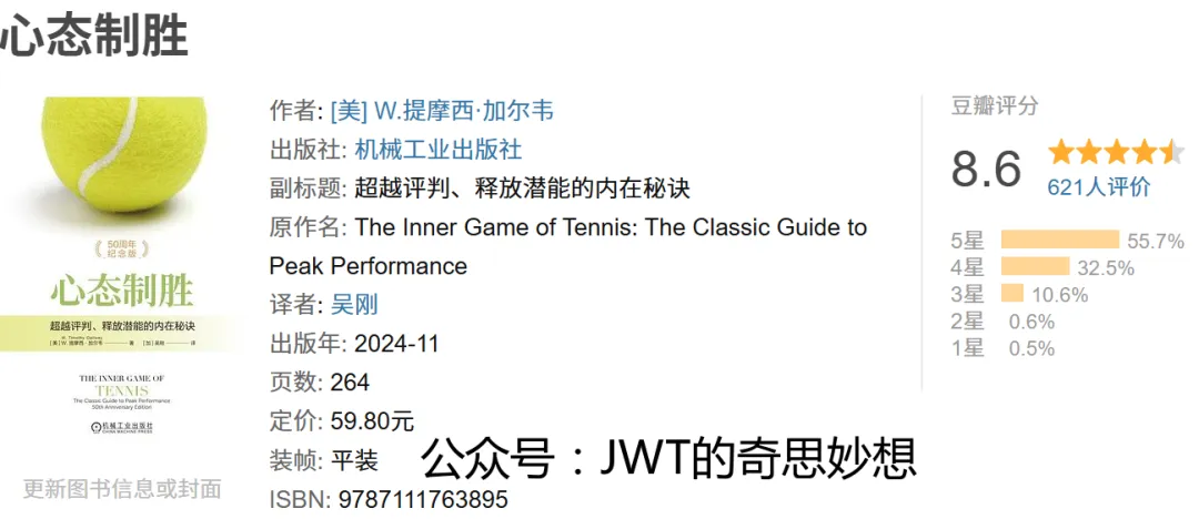 《心态制胜》是美国教练与心理学研究者 W. 提摩西·加尔韦的经典著作,原书名为《网球的内心游戏》。本书以“内在游戏”为核心概念,通过网球运动的实例,系统阐述了如何通过调整内心状态——特别是超越自我评判——来释放潜能、实现卓越表现。