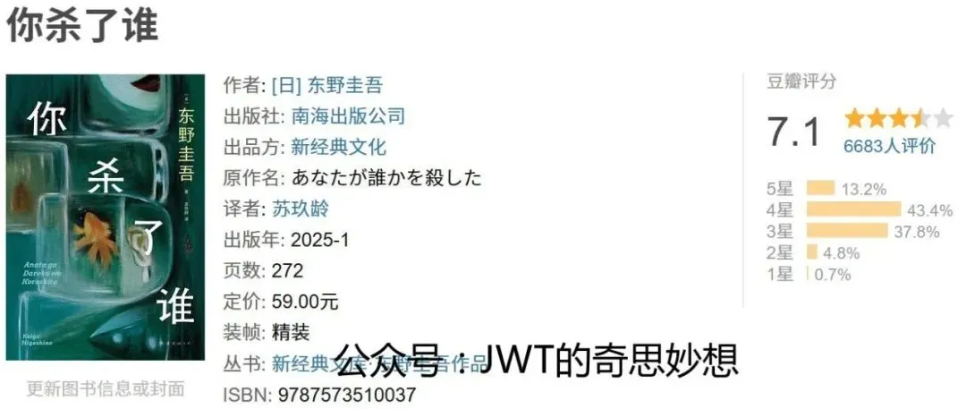 《你杀了谁》是日本作家东野圭吾的悬疑小说,中文版由苏玖龄翻译、南海出版公司出版、新经典文化出品,属“新经典文库·东野圭吾作品”系列。该书于2025年1月出版,精装,共272页,定价59元,豆瓣评分7.1,有6683人参与评价。