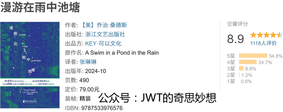 《漫游在雨中池塘》是美国作家乔治·桑德斯的文学评论与写作指南,原著名为A Swim in a Pond in the Rain。本书基于作者在雪城大学享誉盛名的创意写作课程内容,通过精读七篇俄国短篇小说经典(包括契诃夫、托尔斯泰、果戈里等作家作品),深入剖析叙事艺术的奥秘。
